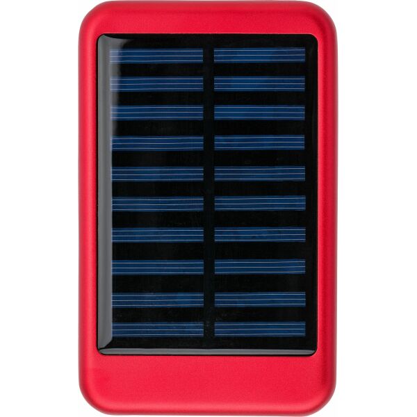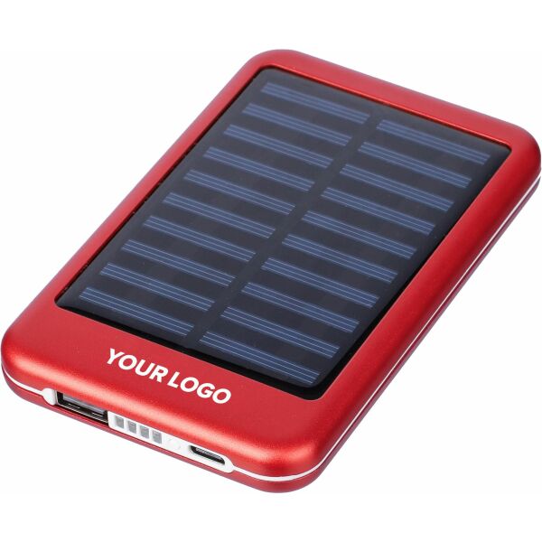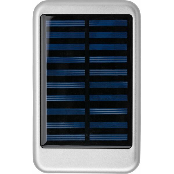 Aluminium solar powerbank met blauwe indicatielampjes. USB-A en USB-C-poort. Ingang DC5V/1A. Uitgang 5V/1A. Capaciteit: 4.000 mAh. Inclusief USB-kabel.