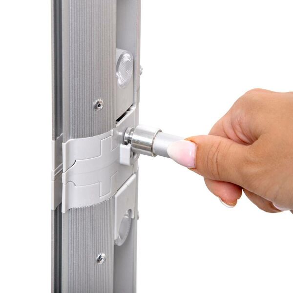 Snel en eenvoudig op te zetten: Haal uit de tas, zet rechtop, klik de middenstang vast en bevestig de textielprint met siliconenrand.