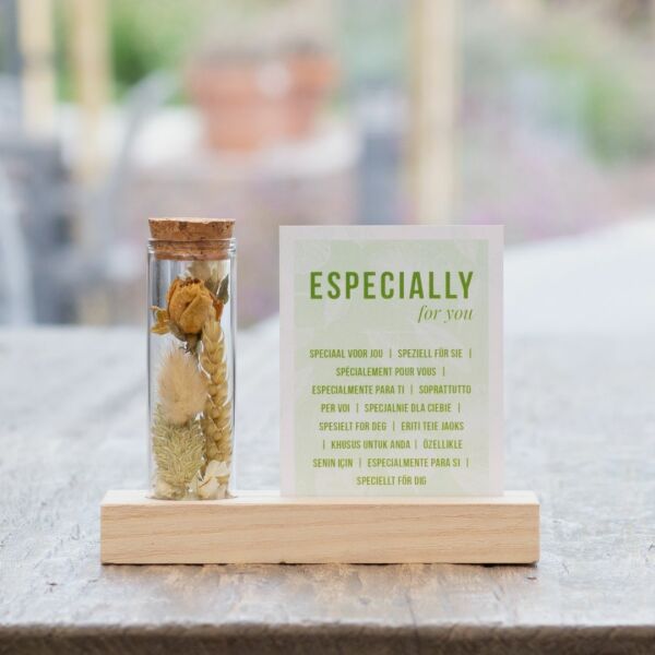 Deze stijlvolle droogbloemvariant bestaat uit één glazen buisje gevuld met kleurrijke droogbloemen, gepresenteerd op een houten standaard met sleuf voor een los A7-kaartje. Zowel het kaartje als het houten blokje kunnen volledig gepersonaliseerd worden met bijvoorbeeld een logo, slogan of boodschap in jouw huisstijl. Bij dit artikel is het A7-kaartje zoals op de foto standaard inbegrepen. Wil je in plaats daarvan een eigen gepersonaliseerd kaartje in full color toevoegen? Kies dan de personalisatie-optie, je betaalt alleen de opstartkosten voor het bedrukken.