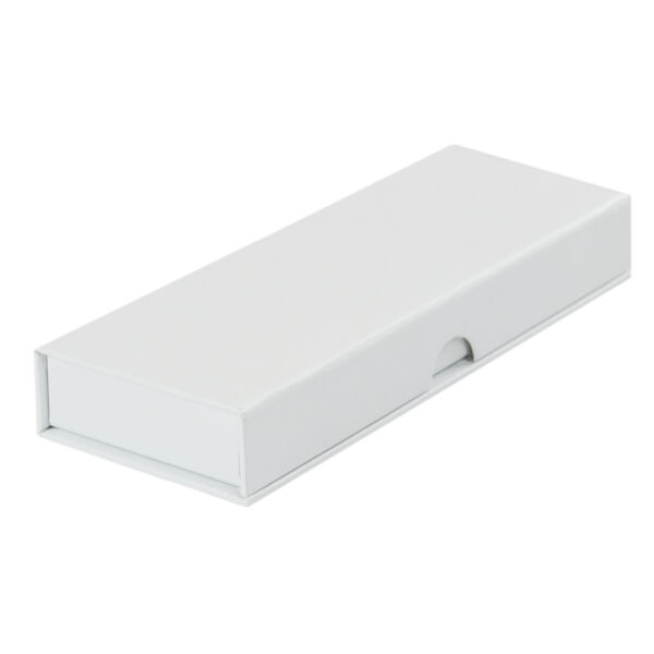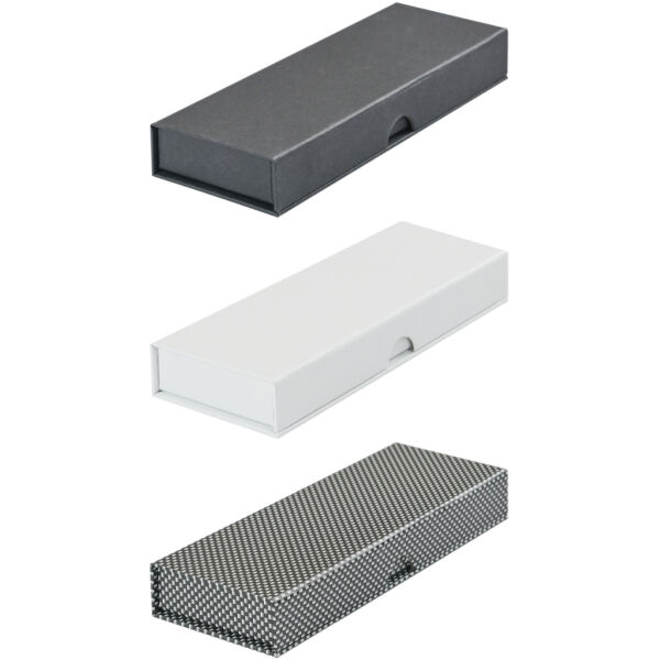 Hinged case with magnetic closure in white, black or carbon fibre look and W-inlay for one, two or three writing instruments. Cardboard slipcase in white. On request the cardboard slipcase is available in a 4c-design.
