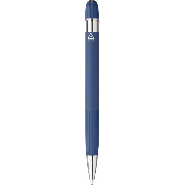 Gerecycled PU notitieboek (A5) en balpenset bestaande uit een notitieboek met 100 gelinieerde pagina’s van 80 gsm papier en een gerecyclede aluminium balpen met rubbercoating. Het notitieboek is voorzien van een lintbladwijzer en een kaft met ribfluweellook aan de bovenkant van voor- en achterkant, met een reliëf gerecycled logo op de achterzijde. De balpen heeft een gestreepte grip en bovenzijde, een verchroomde kunststof punt, drukknop, metalen clip en een lasergegraveerd gerecycled logo. Verpakt in een stevige bruine kartonnen doos met EVA-inlay voor de balpen. Blauwe inkt.