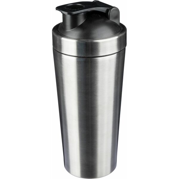 Gerecycled roestvrijstalen enkelwandige sportdrinkfles (750 ml), gemaakt van roestvrij staal 304. Voorzien van een schroefdop van PP en een metalen shakerbal om te mixen. Lasergegraveerd gerecycled logo op de voorkant. Individueel verpakt in een kraftpapieren doos.