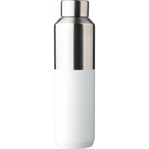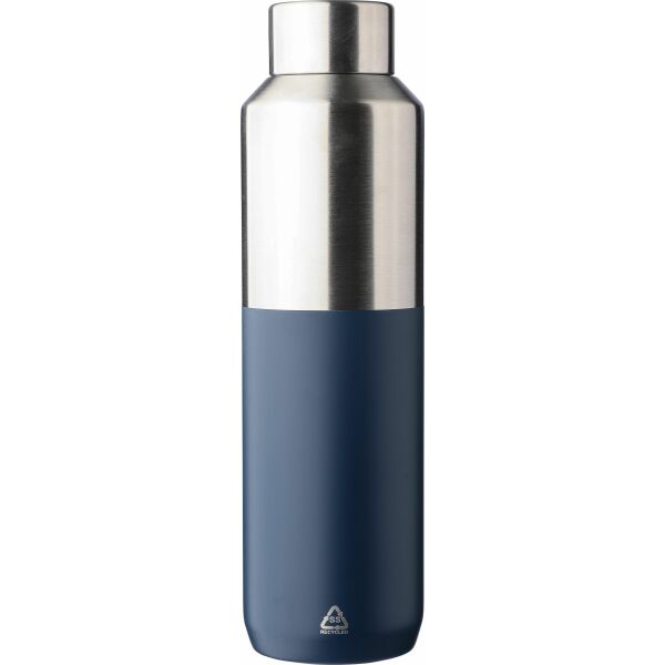 Gerecyclede roestvrijstalen drinkfles (600 ml). Dubbelwandig vacuüm geïsoleerd met een binnenzijde van roestvrij staal 304 en een buitenzijde van roestvrij staal 201. Voorzien van een PP-dop met een bovenkant van roestvrij staal 201. Inclusief gerecycled roestvrijstalen logo aan de voorkant. Individueel verpakt in een bruine kartonnen doos.
