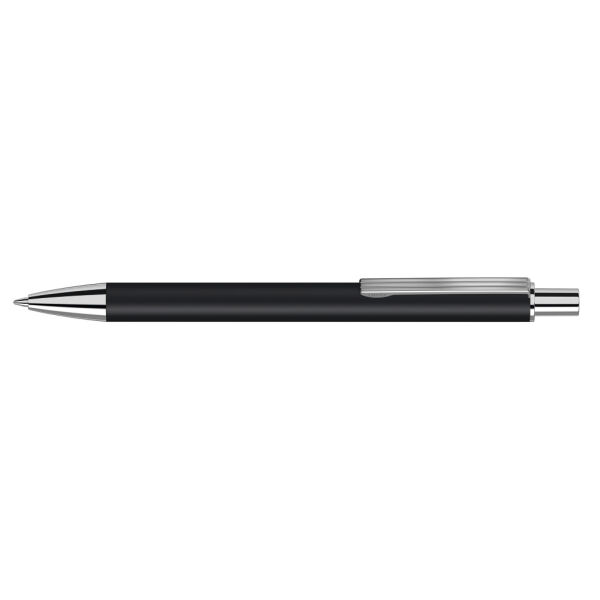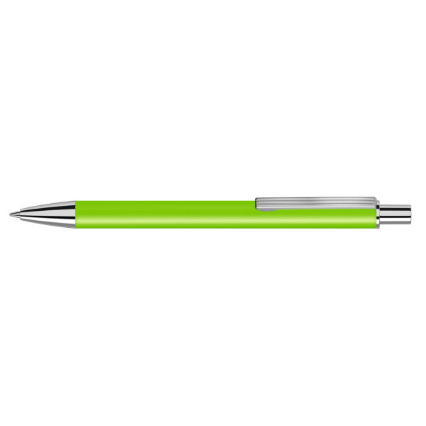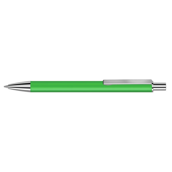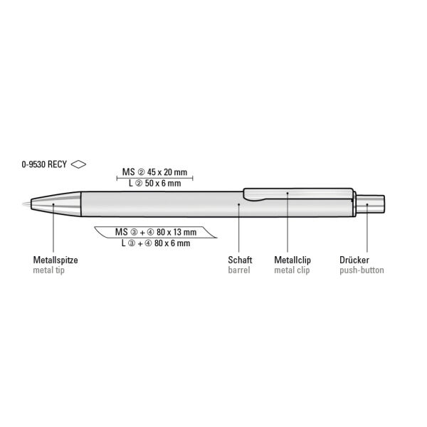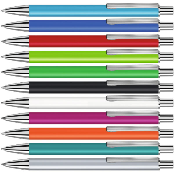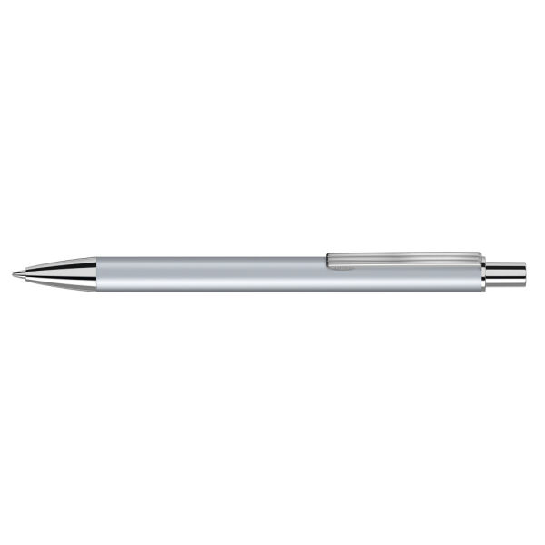 Metal retractable ballpoint pen with matt finish made from recycled aluminium. Metal clip with recessed grooves, metal tip and push-button in glossy silver.