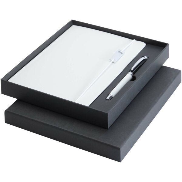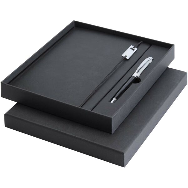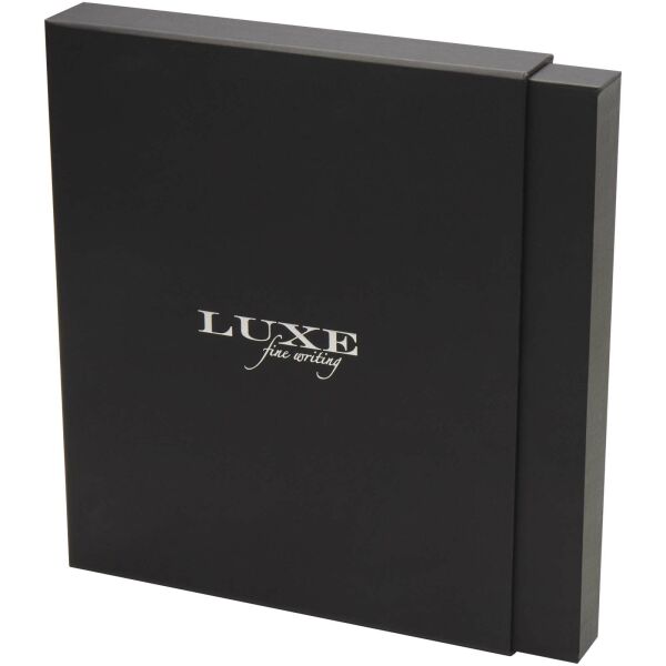 De Legato set is een elegante combinatie van een A5 notitieboek en een rollerbalpen. De pen heeft een RCS-gecertificeerde bovenkant van gerecycled messing met een zilverkleurige chromen afwerking, de onderkant heeft een kleurspray-coating, metalen zilverkleurige chromen accessoires en een LUXE-logo op de middelste ring. Inktkleur: Blauw. Schrijflengte: 400 meter. Stiftmaat: 0,7 mm. Extra zwarte vulling inbegrepen. Het notitieboek heeft 80 vellen gelinieerd crèmekleurig papier van 80 g/m² en heeft een kaft van gerecycled kunstleder, een elastische sluiting, een lintmarkering en een accordionvak. Zilververchroomd metalen accessoire op de elastische sluiting. Geleverd in een kartonnen geschenkverpakking.