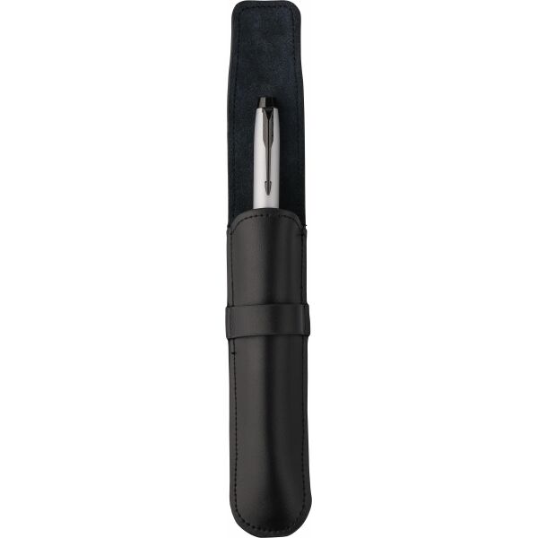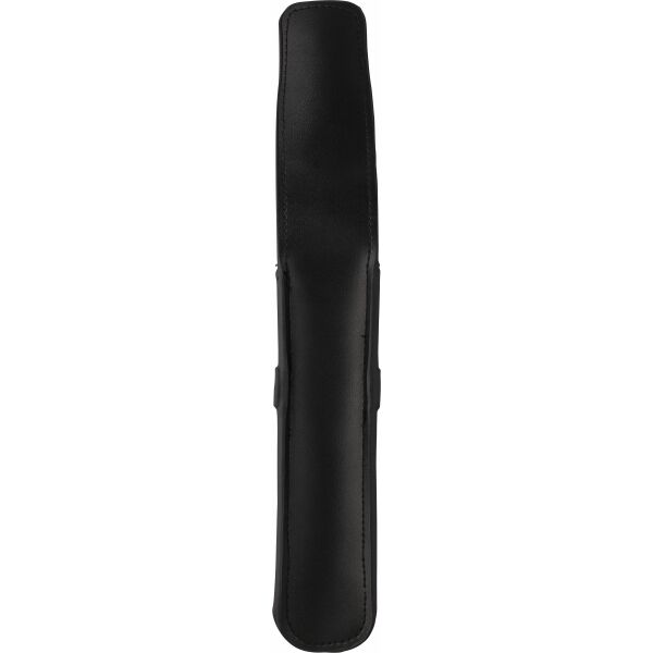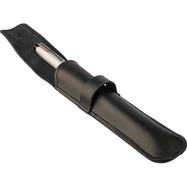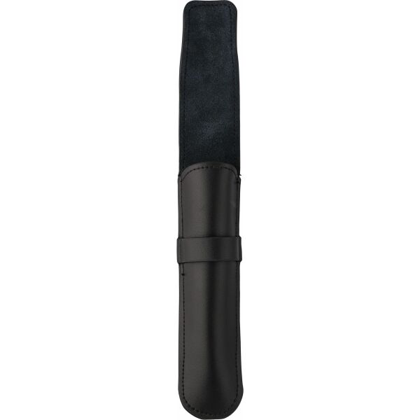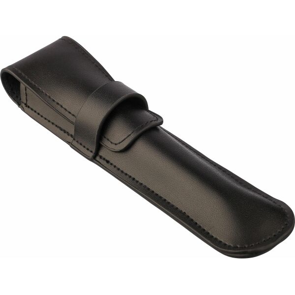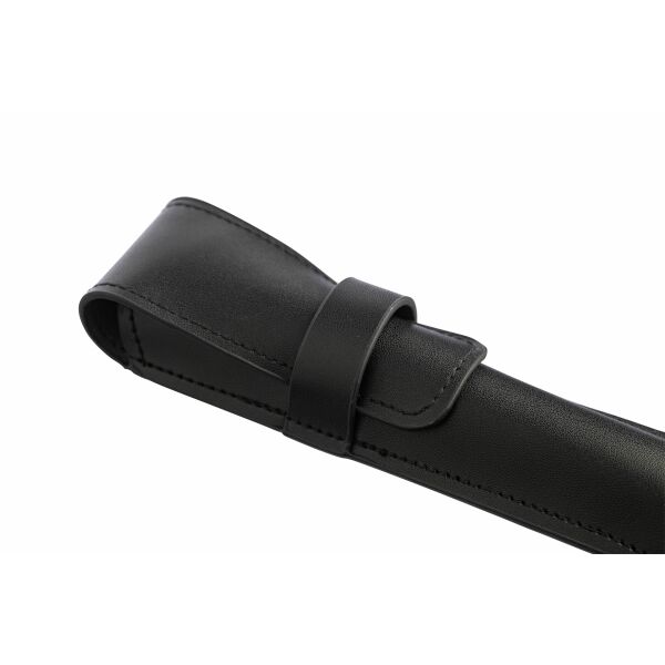Leren (tweelagige) pennenetui met klep en riemsluiting. Voorzien van zachte fluwelen binnenzijde. Individueel verpakt in een zwarte kartonnen hoes. Runderleer.