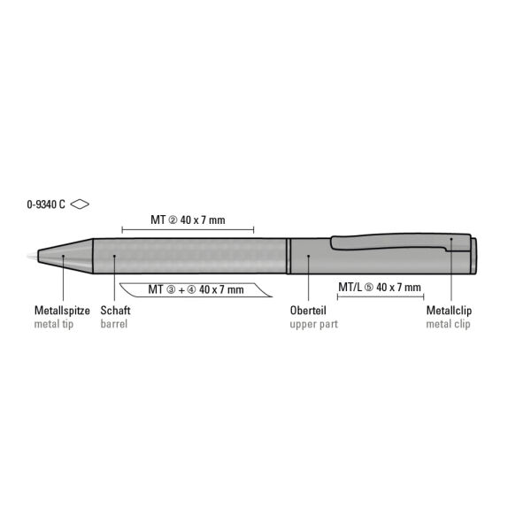 Metal twist ballpoint pen with carbon fibre in black, soft twist mechanism and a spring-mounted metal clip. Fittings black matt.