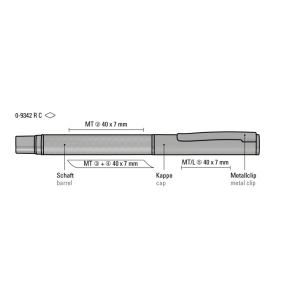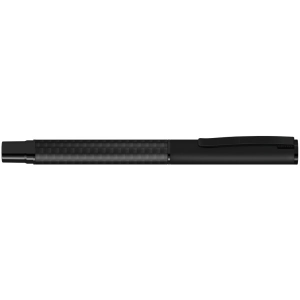 Metal rollerball with carbon fibre barrel in black and spring-mounted metal clip. Fittings black matt.