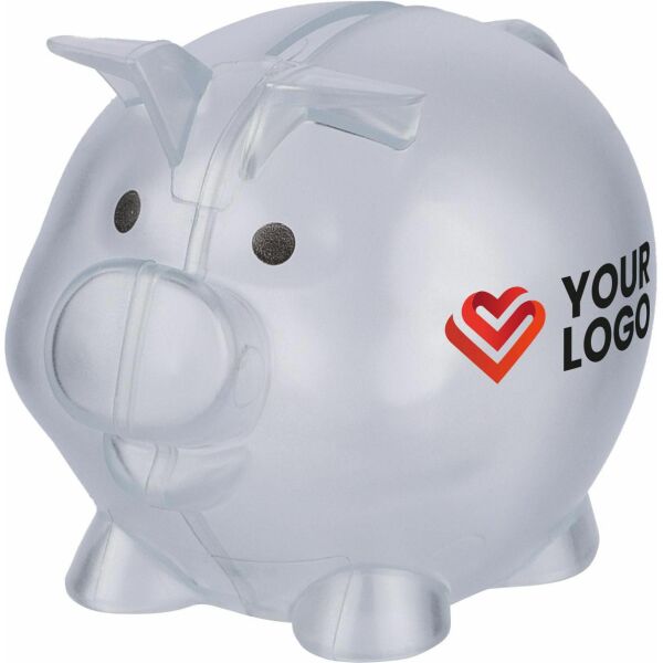 Spaarvarken van gerecycled PS-plastic in de vorm van een varken. Transparante uitvoering met gerecycled logo op de achterkant.